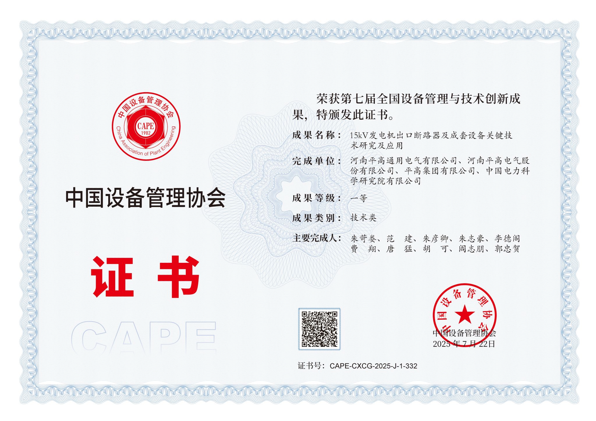 近日,第七届全国设备管理与技术创新成果评选揭晓,由河南平高通用电气有限公司联合平高电气配电院自主研制的“15千伏发电机出口断路器及成套设备”荣获技术类成果一等奖!该成果攻克大容量真空开断、高可靠性机构设计等核心技术,综合性能达国际先进水平,为平高能源装备自主化再添里程碑!