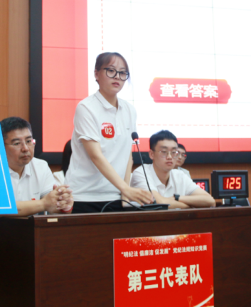 必答环节,各代表队选手依次答题,选手沉着应对、对答如流,向观众展示了新时代党员干部厚积薄发、力争上游的精神风采;抢答环节将活动气氛推向了高潮,在抢答器的“催促下”,在计时器的“见证下”,在分值的“压力下”,形成“你追我赶”紧张而又热烈的场面,各代表队选手们快速而准确的回答赢得了场下观众的阵阵掌声。风险环节,各代表队不畏挑战、你追我赶,气氛紧张激烈。整场比赛高潮迭起、精彩纷呈,选手们冷静思考、密切配合,展现出丰富的纪法知识储备和良好的团队协作精神。