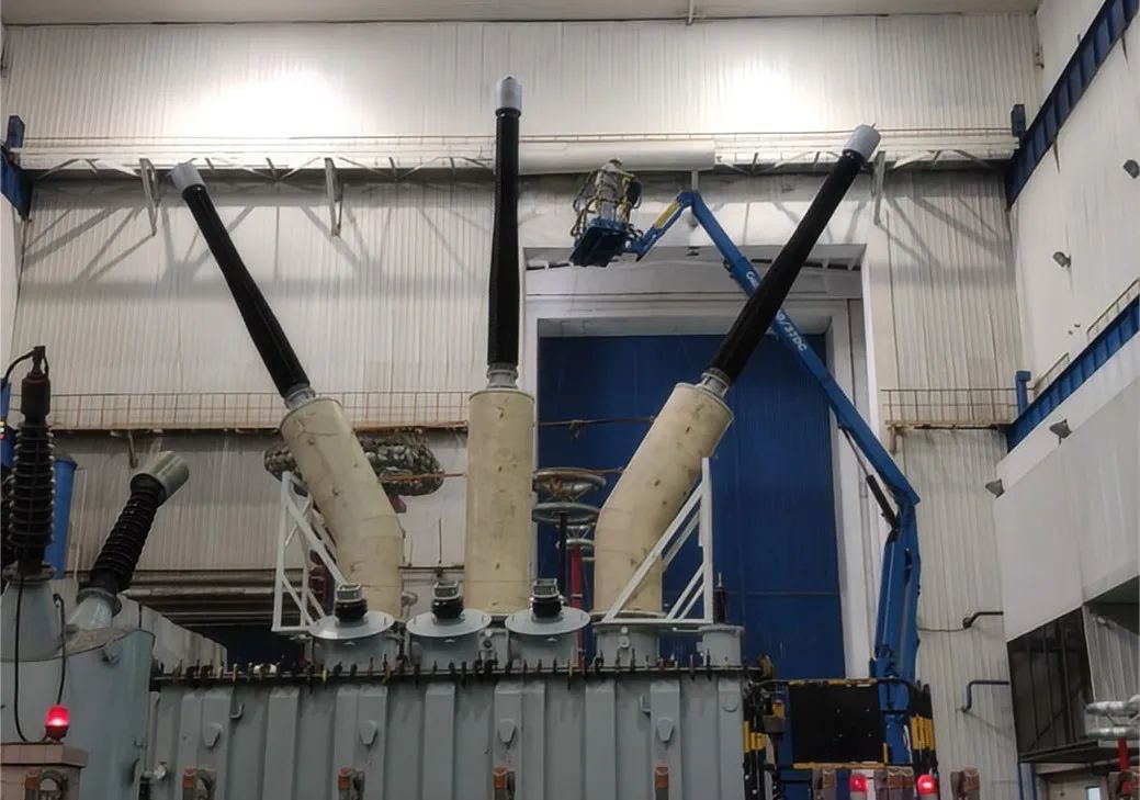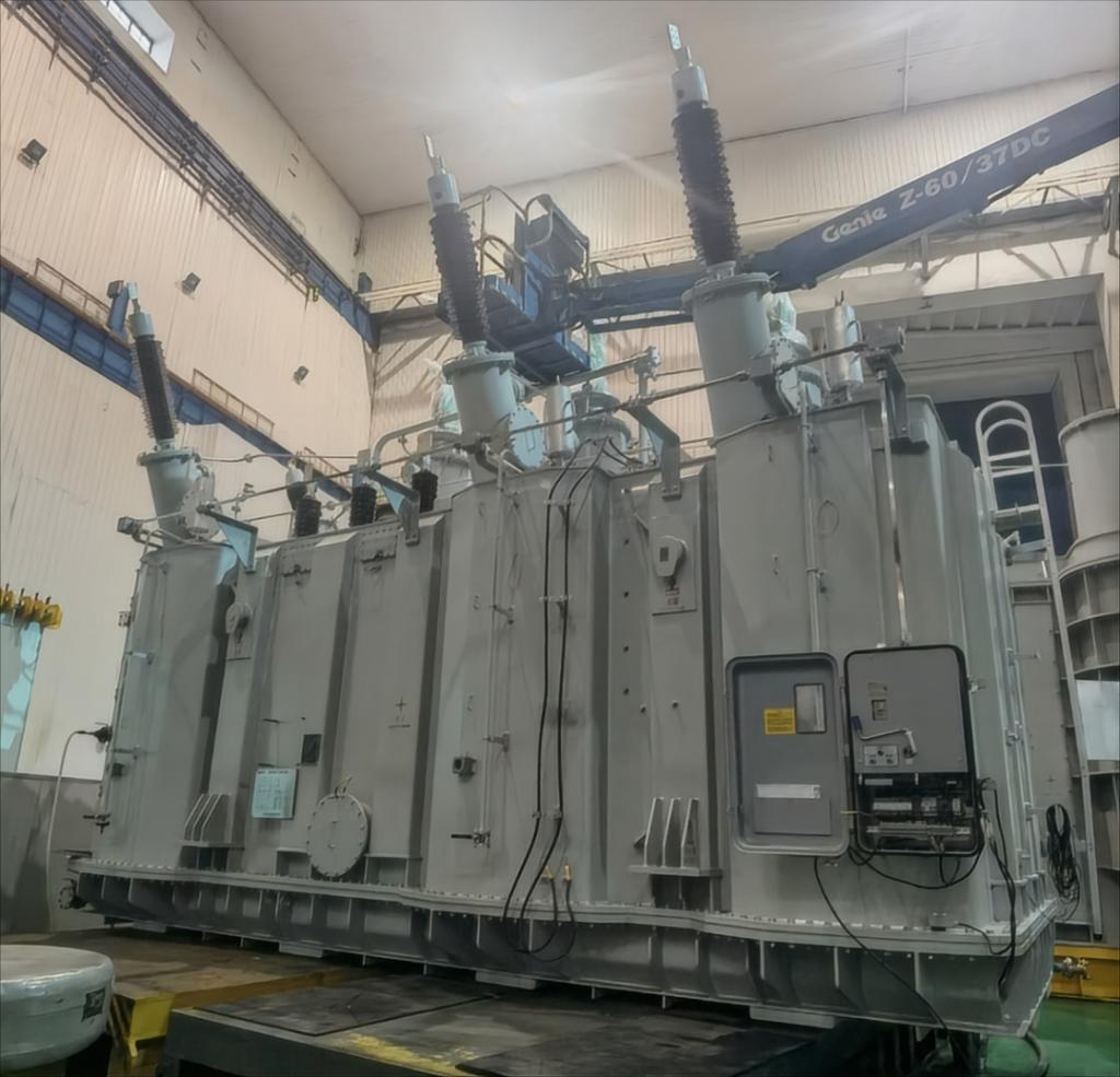 该项目是中国电气装备科技指南项目。该产品结构合理、设计先进,铁心为单相四柱式,上下铁轭为“D”型轭,两主柱的高、中、低压绕组均为并联运行,高压、中压绕组为内屏连续式,低压绕组为连续式,通过对线圈结构及油流通道进行优化,降低了涡流损耗及温升,中压线圈出头在高压线圈端部完成联接,简化了中压引线结构。高压出线装置内置,经套管由箱盖直接引出,减少了现场安装的工作量,具有损耗低、局放小、温升低、噪声低等特点。