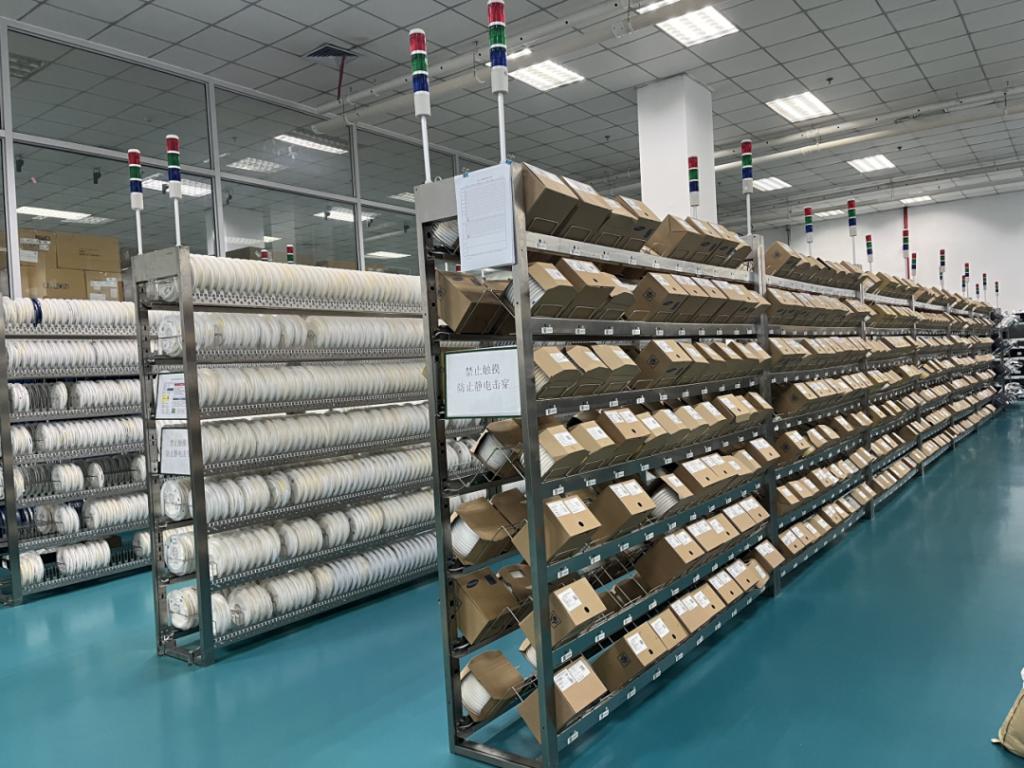 自主开发智能仓储系统与智能灯带、射灯、料架、可视化大屏等设备集成通信,通过物料标识标准化、条码识别和物联网技术,实时监控和记录数据,通过系统运算与灯带指引、扫码验证相结合,实现物料管理防呆防错;通过自动化设备和精益算法运用,提高物料出入库、盘点等作业效率。