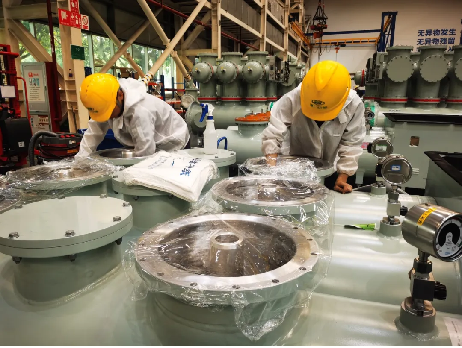 伴随着警笛声,挑高20米的无尘车间内,行车伸出强有力的“手臂”将零部件吊装至适宜高度,根据工人装配需求,进行多角度旋转。这样“人机共舞”忙碌的景象正在厦门许继高压生产车间中上演。