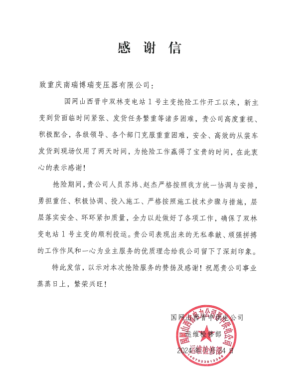 近日,山东电工电气所属重庆博瑞收到国网山西电力晋中供电公司的感谢信,信中对重庆博瑞在山西晋中双林变电站抢险工作中展现出的高效协调能力与产品质量保障给予了高度评价。