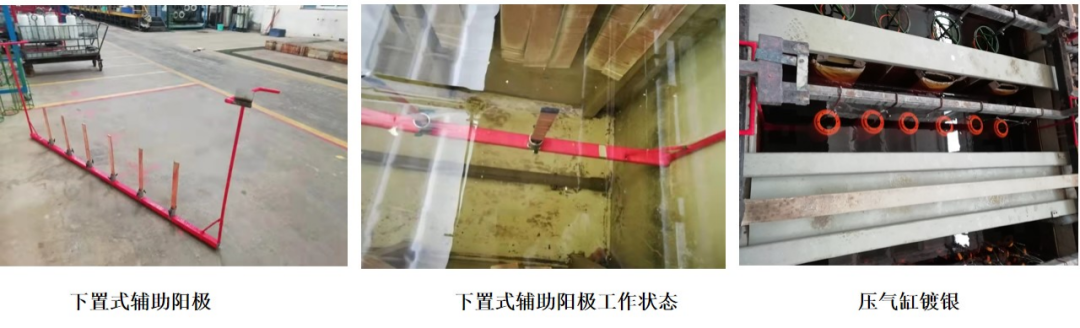 针对原辅助阳极的不足制定改善措施,利用车间闲置的不锈钢材料焊接制作成一个新结构的辅助阳极,新辅助阳极整体布置在镀槽底部,可以夹装6块铜板、银板,镀铜、镀银过程中通过辅助阳极上铜板、银板的电解,并及时补充压气缸内腔溶液中消耗的铜离子、银离子,保证了压气缸内腔电镀溶液成分的稳定。经过近一个月的生产验证,采用新结构的辅助阳极生产的压气缸内腔镀层外观良好,无发黑、起黑点等问题,零件热震无起泡,满足了百万伏零件质量要求。