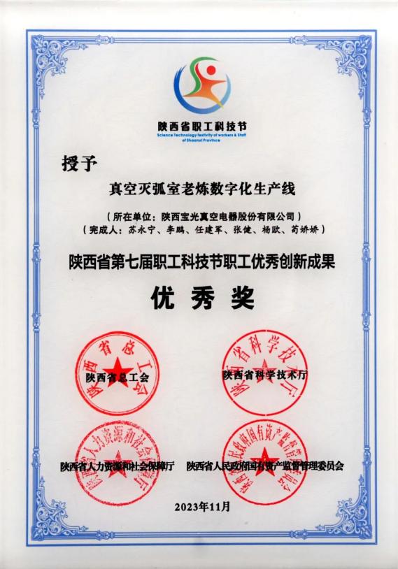 陕西省职工优秀创新成果优秀奖——中国西电集团所属宝光股份 “真空灭弧室老炼数字化生产线”