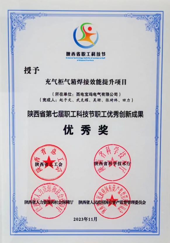 陕西省职工优秀创新成果二等奖——中国西电集团所属西电宝鸡电气 “充气柜产业能力提升”