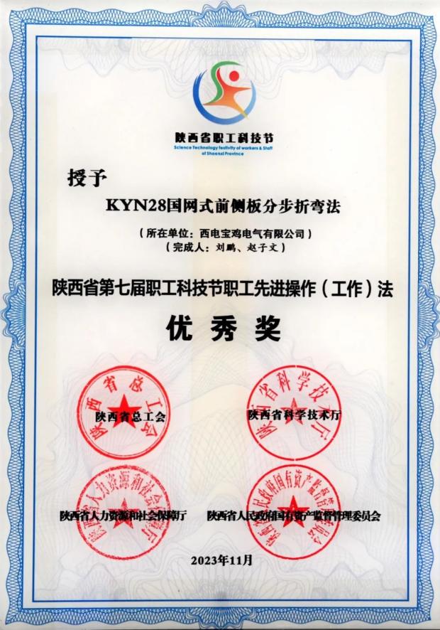 陕西省职工先进操作(工作)法优秀奖——中国西电集团所属西电宝鸡电气“KYN28国网式前侧板分步折弯法”