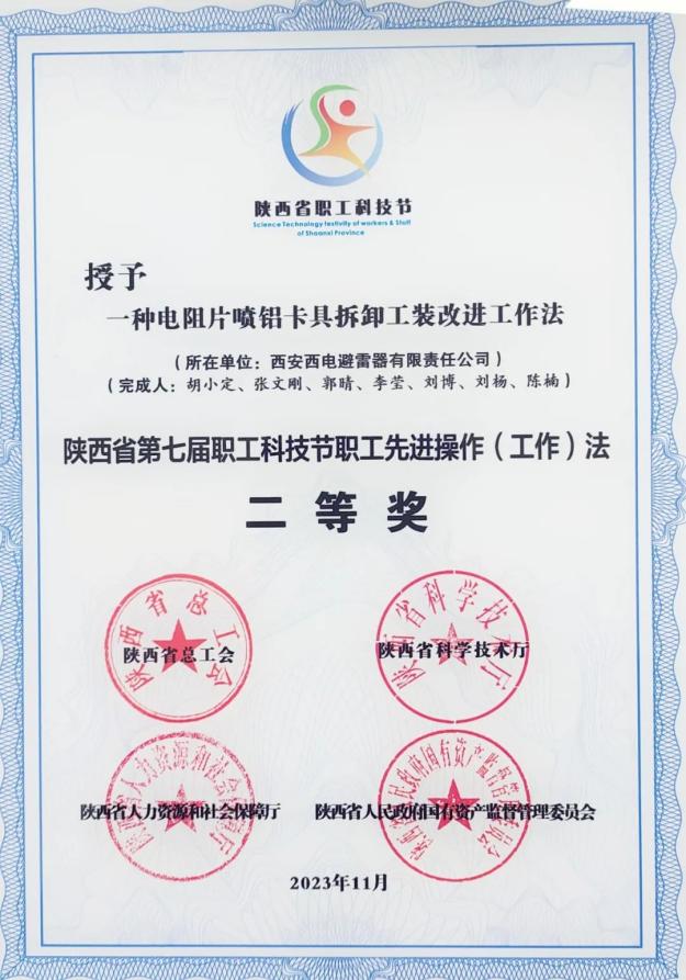 陕西省职工先进操作(工作)法优秀奖——中国西电所属西电避雷器“一种提高电阻片造粒料回收率和质量的先进操作方法”