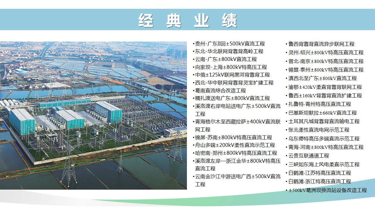 重大工程:参与建设了青海-西藏、锡盟-泰州、乌东德、白鹤滩-江苏等国内全部特高压直流输电工程,以及晋东南、锡盟-山东、淮南-南京-上海等国内诸多特高压交流输电工程;参与建设巴基斯坦默拉直流、土耳其凡城特高压工程,为中国装备“走出去”、服务“一带一路”建设提出了中国方案,做出了突出贡献。