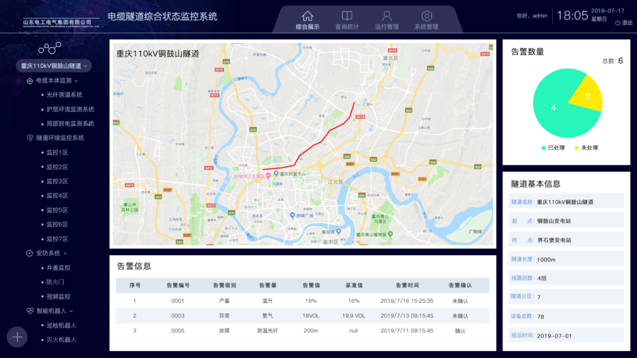 电缆隧道综合监控系统由山东电工电气所属数字科技自主研制,通过国家级新产品鉴定,达到国际先进水平。该产品具有电缆线路及通道环境状态综合诊断、风险预警、差异化运维决策、老化评估、退役决策等智能化运维管控功能。产品先后在重庆江北110千伏电缆隧道综合监控工程、西安东北部330千伏架空线路迁改落地工程等国家电网重点示范工程应用。