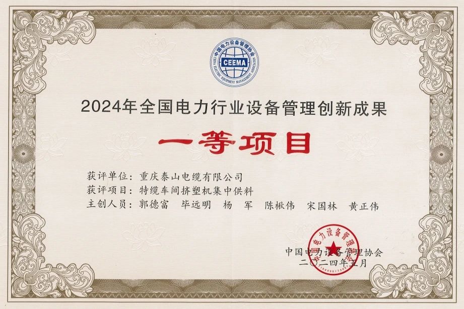 全国电力行业设备管理创新奖由中国电力设备管理协会评委组通过严格筛选、专家多轮评审,从成果创新性、实用性、社会效益等多方面综合研判评选而出,涵盖全国范围内各大电力能源公司,具有行业标杆意义和示范引领作用。本次特缆车间挤塑机集中供料项目获得一等奖,标志着泰山电缆在设备管理领域的创新实践得到了行业的高度认可。