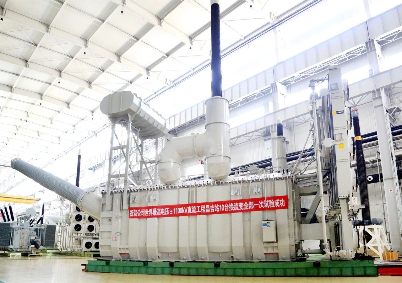世界上电压等级最高、技术水平最先进的特高压换流变压器:昌吉-古泉±1100千伏特高压直流输电工程用换流变压器为单相、双绕组有载调压变压器,容量607.5兆伏安,网侧电压等级为750千伏。该项目的成功研制,创造了世界电压等级最高、单台产品容量最大、技术水平最先进、制造难度最大、项目所有产品全部一次成功的世界纪录。