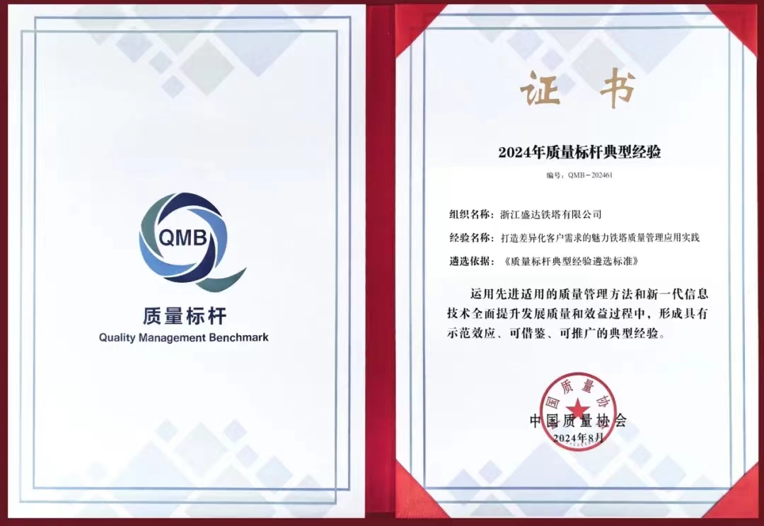 实施质量全过程管理联动,打通价值链,实现组织愿景。浙江盛达通过在规划、设计、采购、制造、服务和革新等方面的全面布局和深入实施,不断提升企业核心竞争力,品牌影响力深入人心。先后获得国家知识产权68项,参与1项国家标准、6项行业标准、6项社会团体标准编制;产品合格率连续多年保持稳定可控,参与建设全球最高输电铁塔、全世界首条500千伏双回路钢管杆工程等多个示范项目,高端装备市场竞争力逐年增强,成长为全球输电线路铁塔行业金字招牌。