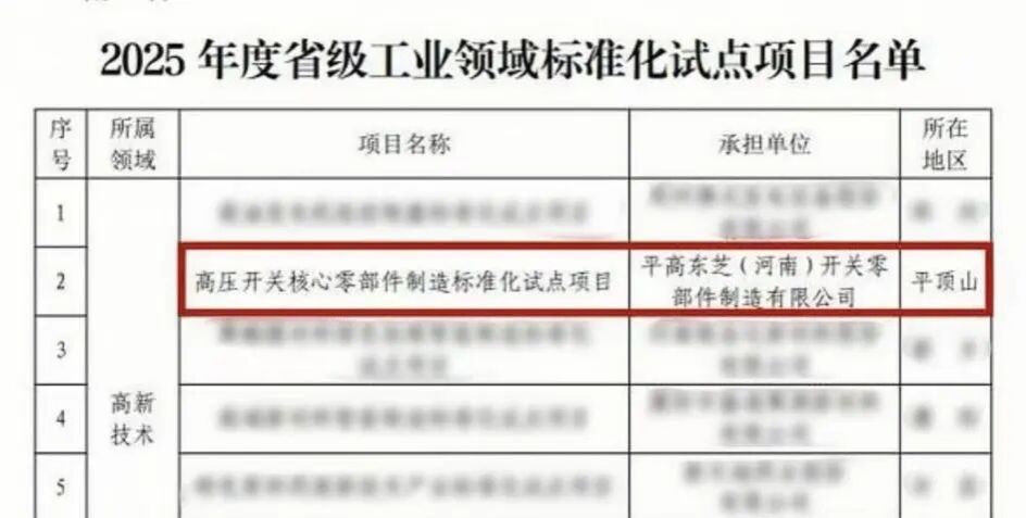 近日,平高东芝(河南)开关零部件制造有限公司(以下简称“平高东芝(河南)”)传来重磅喜讯,成功入选2025年度省级工业领域标准化试点项目名单。