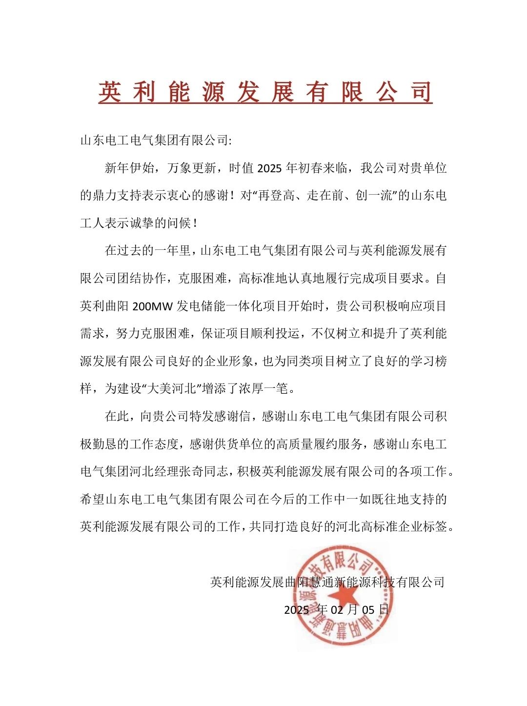 山东电工电气收到英利能源发展曲阳慧通新能源科技有限公司发来的表扬信。信中指出,在英利曲阳200兆瓦发电储能一体化项目建设过程中,集团积极响应项目需求,努力克服困难,保证项目顺利投运,以优质服务为同类项目树立良好榜样,以卓越品质提升山东电工品牌影响力。