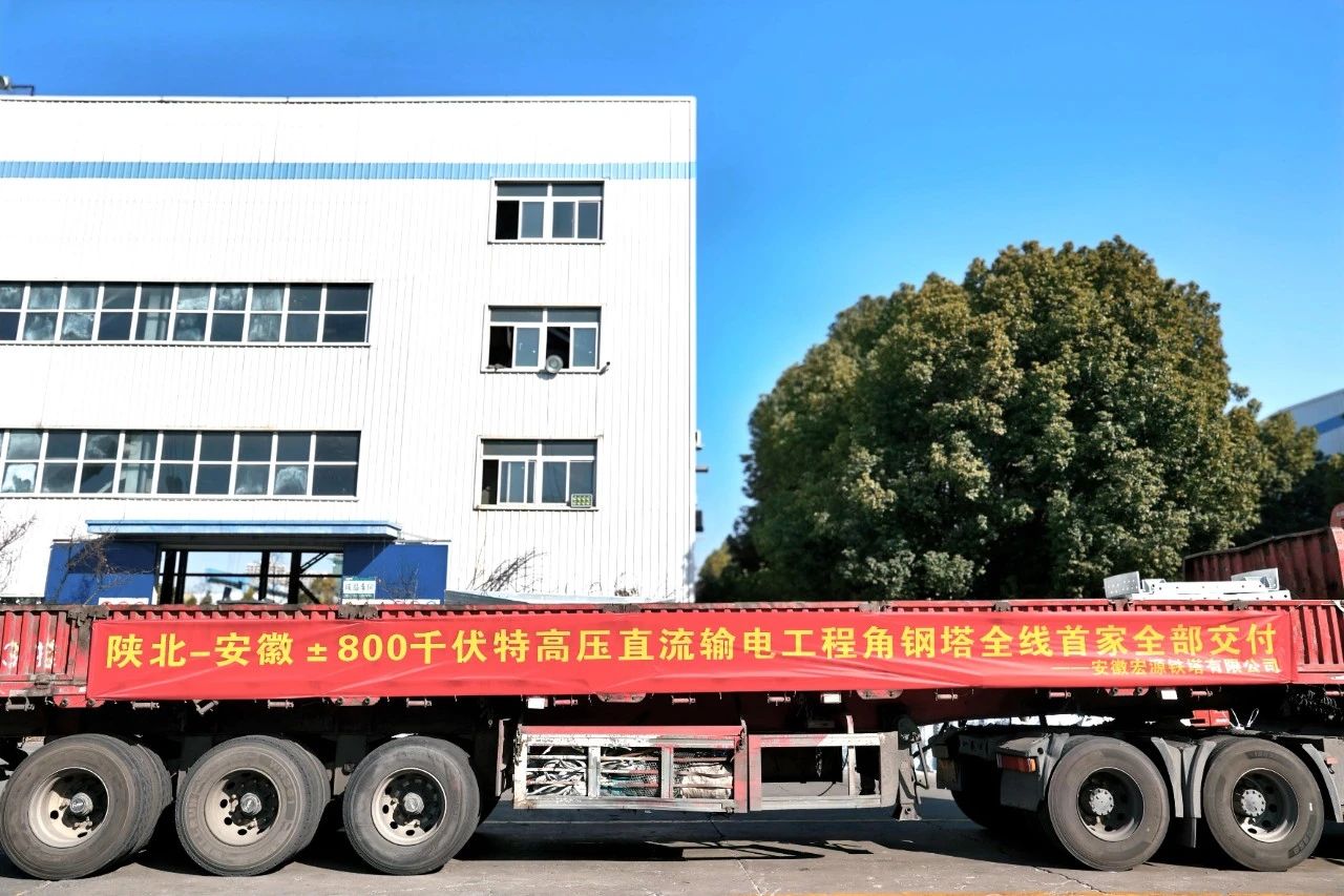 近日,山东电工电气所属安徽宏源供货的陕北-安徽±800千伏特高压直流输电工程角钢塔全部完成交付,提前5个月完成发运交付,是该特高压工程全线首个角钢塔全部交付的供货单位,安徽宏源为该工程供货103基角钢塔,共7084吨。
