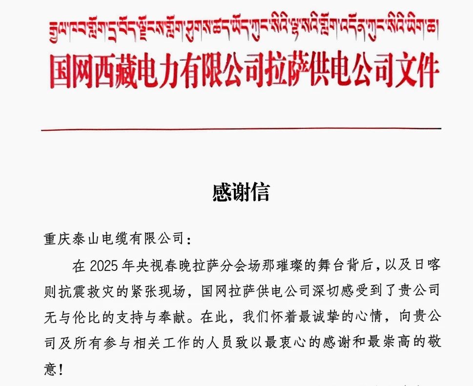 近日,山东电工电气所属重庆泰山收到国网西藏电力拉萨供电公司发来的感谢信。信中对重庆泰山和所有参与央视春晚拉萨分会场保电、日喀则抗震救灾工作的人员,致以最衷心的感谢和最崇高的敬意!并表示希望在未来的日子里,与企业携手共进,为保障电力供应、服务社会发展作出更大贡献。